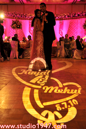 DJ, MC, lighting tech, dhol player, premium sound system, sound system for cocktail hour, 42 color kinetics LEDs for up lighting, 3 custom monograms, 4 Martin 250 Entour moving heads on draped trusses providing different lighting effects through out the evening, and two big screen projections.