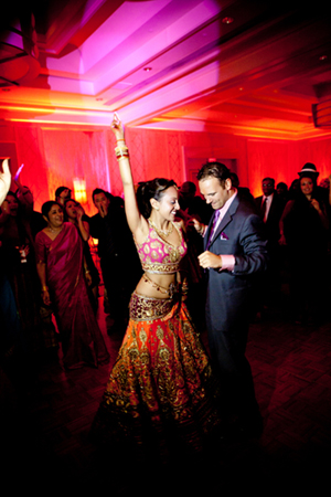 DJ, MC, lighting tech, dhol player, premium sound system, sound system for cocktail hour, 42 color kinetics LEDs for up lighting, 3 custom monograms, 4 Martin 250 Entour moving heads on draped trusses providing different lighting effects through out the evening, and two big screen projections.